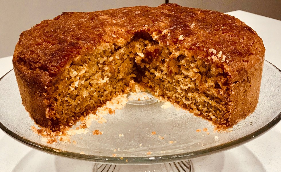 - Transfer cake to serving platter, poke holes all around with the skewer, and pour warm syrup over. Allow the syrup to be absorbed before slicing and serving.