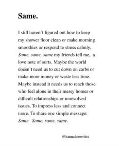 I still haven’t figured out how to keep my shower floor clean or make morning smoothies or respond to stress calmly. Same, same, same my friends tell me, a love note of sorts. Maybe the world doesn’t need us to cut down on carbs or make more money or waste less time. Maybe instead it needs us to reach those who feel alone in their messy homes or difficult relationships or unresolved issues. To impress less and connect more. To share one simple message: Same. Same, same, same.