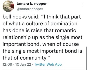The size and shape of community has changed over the years. So has the number of communities I’m part of. Many, topic-specific communities have bloomed where only one cultural community existed. Some communities are dog-shaped, others are word-shaped, some are school or university-shaped, a few are work-shaped, and yet others take the form of long-standing friendships that grew from those early cultural connections. Some of them are points of daily (or more frequent) connection, others are weekly or monthly, others are irregular and rare. All of them require tending and curation, all of them challenge me and push me forward in unexpected ways, all of them ground me. All of them are sources of joy.